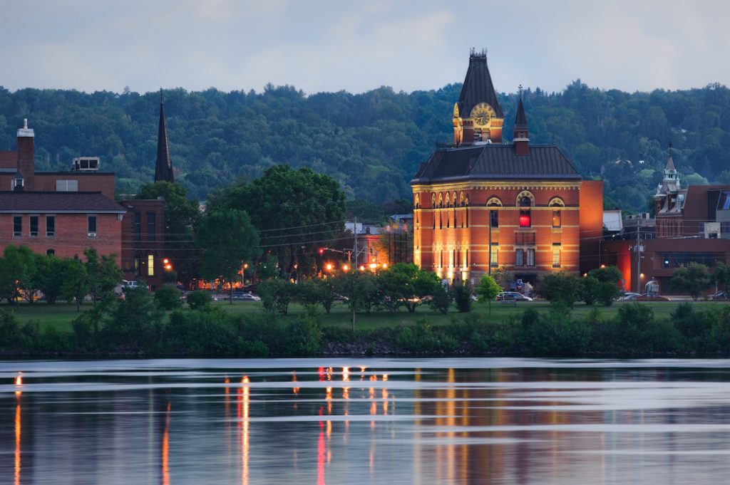 March 16 2021 City hall reflected in the Saint John River in downtown Fredericton, New Brunswick, Canada Pam Beyea